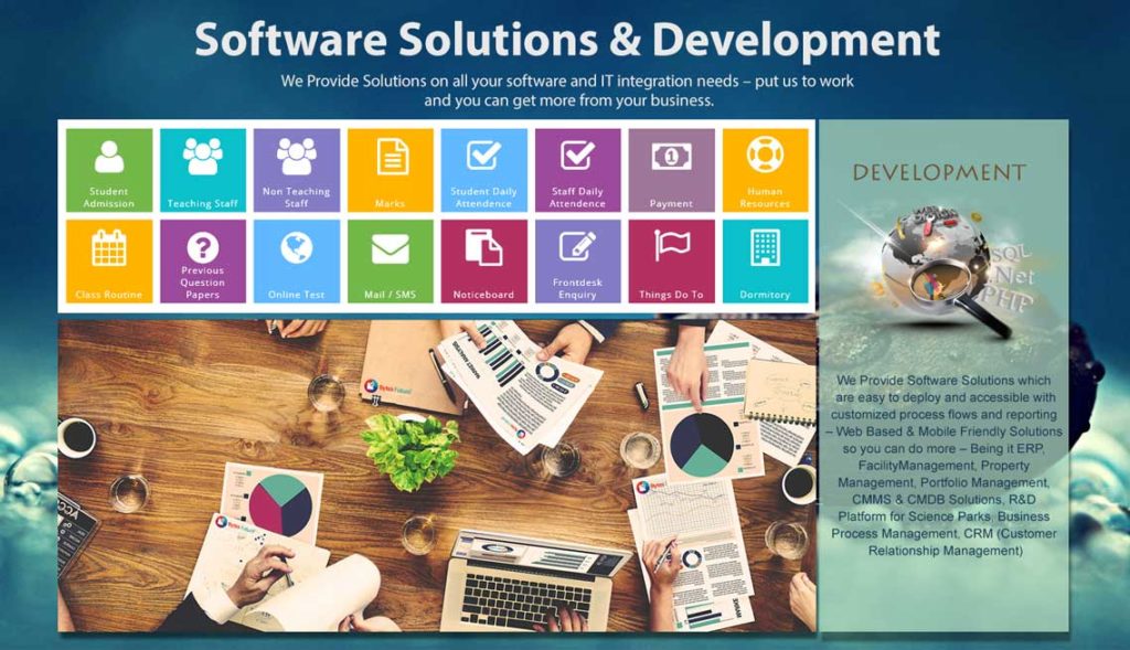 We Provide Software Solutions which are easy to deploy and accessible with customized process flows and reporting – Web Based & Mobile Friendly Solutions so you can do more – Being it ERP, Facility Management, Property Management, Portfolio Management, CMMS & CMDB Solutions, R&D Platform for Science Parks, Business Process Management, CRM (Customer Relationship Management) We Provide Solutions on all your software and IT integration needs – put us to work and you can get more from your business.